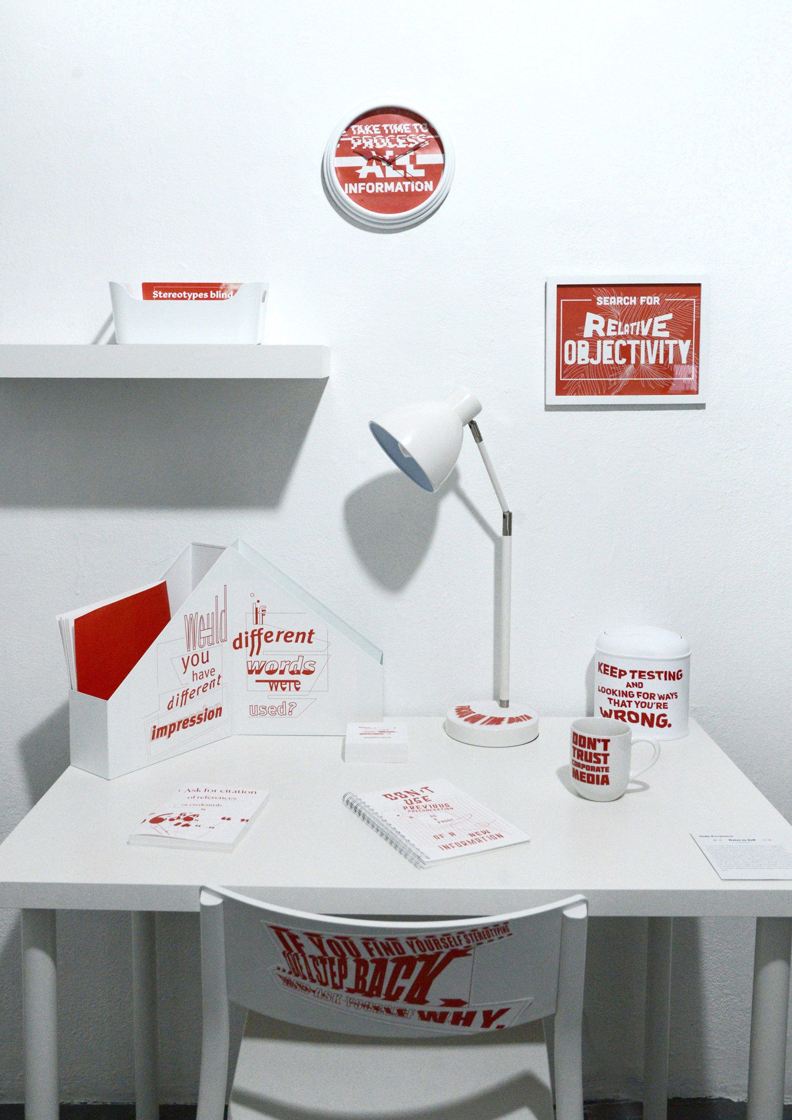 Installation artwork “Notes to Self” is a set of designed objects creating working space. Each object is designed to have a message — rules how to fight cognitive biases. The artwork sets up an environment where people constantly remind themselves to accept different people and opinions different from their own.